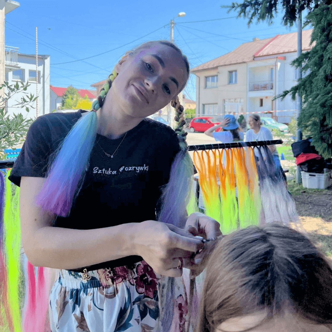 • Szalony fryzjer – kolorowe warkoczyki, brokat do włosów i zabawne stylizacje.